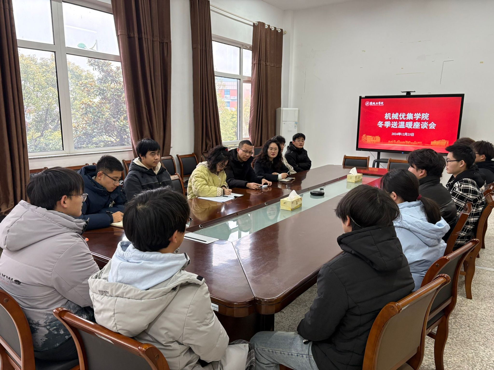 12月25日下午三点南校区机械馆A223会议室,机械优集学院联合一站式学生社区举办“冬季送温暖”师生座谈会,机械优集学院党委副书记闫小民、辅导员苏雅及“冬季送温暖”获助学生参加,学工办主任程云庆主持。