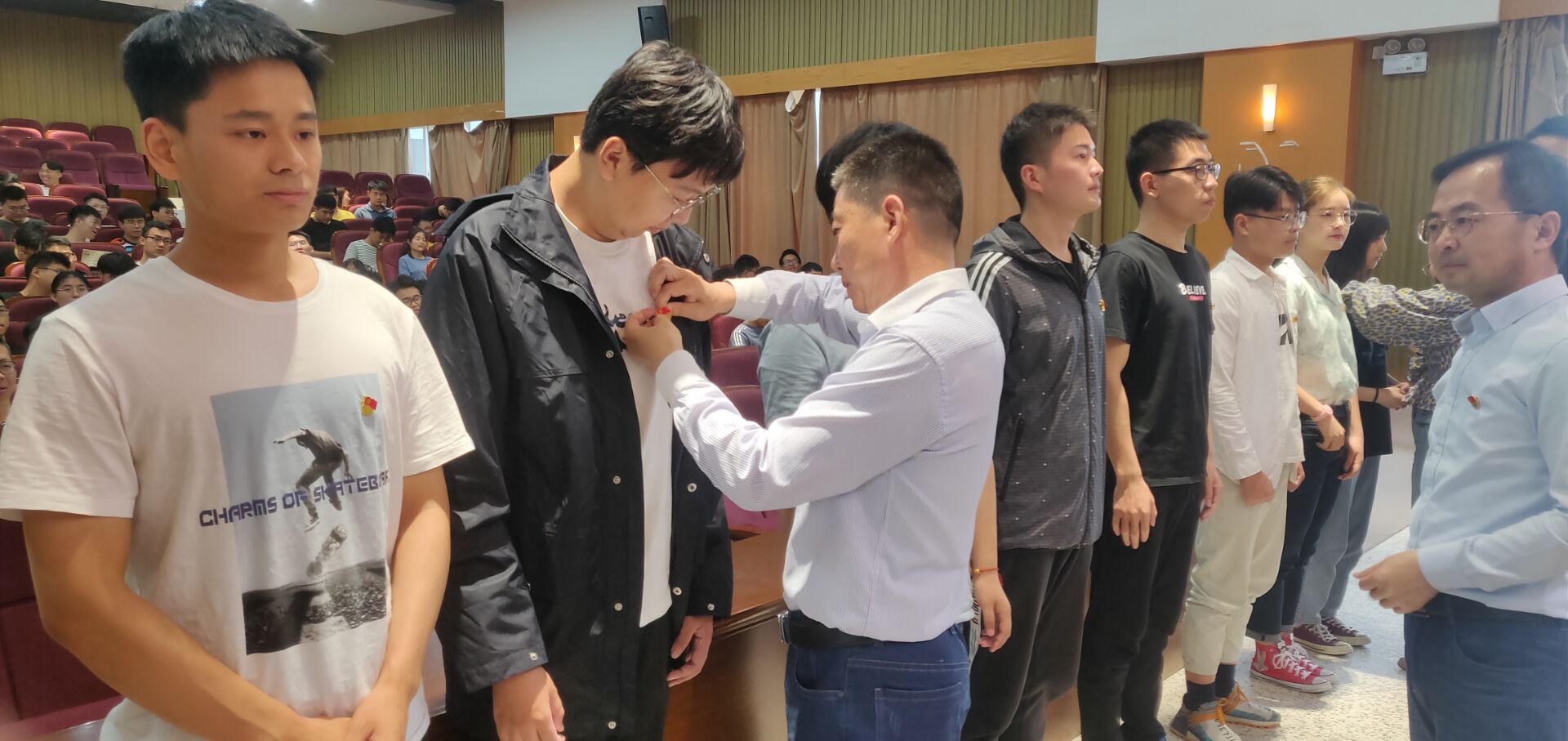 会上,秦卫兵宣读学生新党员名单并介绍了学生党员队伍建设情况,张长生老师带领全体新党员进行了入党宣誓,学院党委负责同志和党支部书记为新党员代表配戴党员徽章。新党员本科生代表何乾坤、研究生代表徐苏柏作表态发言。