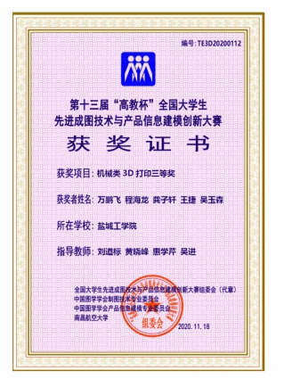 由机械工程学院刘道标、黄晓峰、惠学芹、吴进等老师指导的,机械工程学院、优培学院王捷、万鹏飞、吴玉森、龚子轩、程海龙、王志江、陆健、方灿等同学组成的机械类团队在比赛中取得较好的成绩,共获得单项一等奖1项、单项二等奖4项、单项三等奖3项,团体二等奖1项。