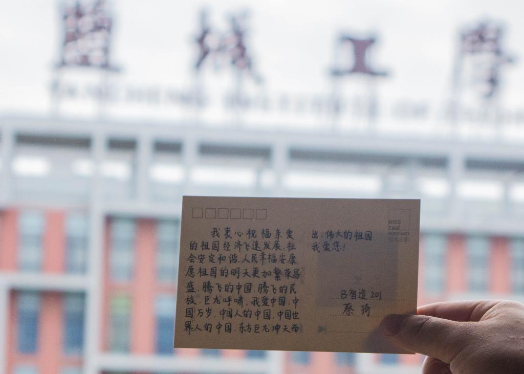 红歌嘹亮,红旗飘飘。10月1日上午,同学们就拿上明信片,亲手写下自己对祖国的祝福与美好期待。中秋节和国庆节,一个是中华民族传统节日,一个是祖国母亲的生日,双节同至,举国上下同欢庆,也有人说中秋国庆各取一字,便是“中国节”。有同学写到“祖国是东方的明珠,是亚洲腾飞的巨龙,是地平线上初生的太阳;祖国在你心中,在我心中,在每一个中国人心中。”有同学写下了对祖国的美好期望“太阳从东方升起,希望从东方升起,愿祖国未来美好无限。”在接下来的假期中,同学们纷纷写下自己对祖国的赞美和热爱,用洋溢的青春向祖国母亲告白。