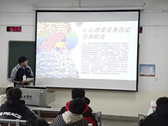 为更好的推进校园心理健康工作,加强心理委员的能力,2月19号下午三点,机械优集学院心理部在北校区知行楼201组织心理委员培训活动。