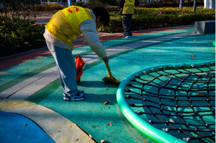 活动现场,第一组志愿者负责中心草坪区域及周边绿化带的落叶清扫工作,使用专业工具对草坪进行系统性清理;第二组志愿者重点负责步行道及两侧休憩区的清洁维护,确保游客通行区域的整洁有序;第三组志愿者则专门负责健身器材区域的卫生清洁,为市民提供安全卫生的休闲环境。每组志愿者都在指导人员的专业带领下,高效有序地开展清洁工作。
