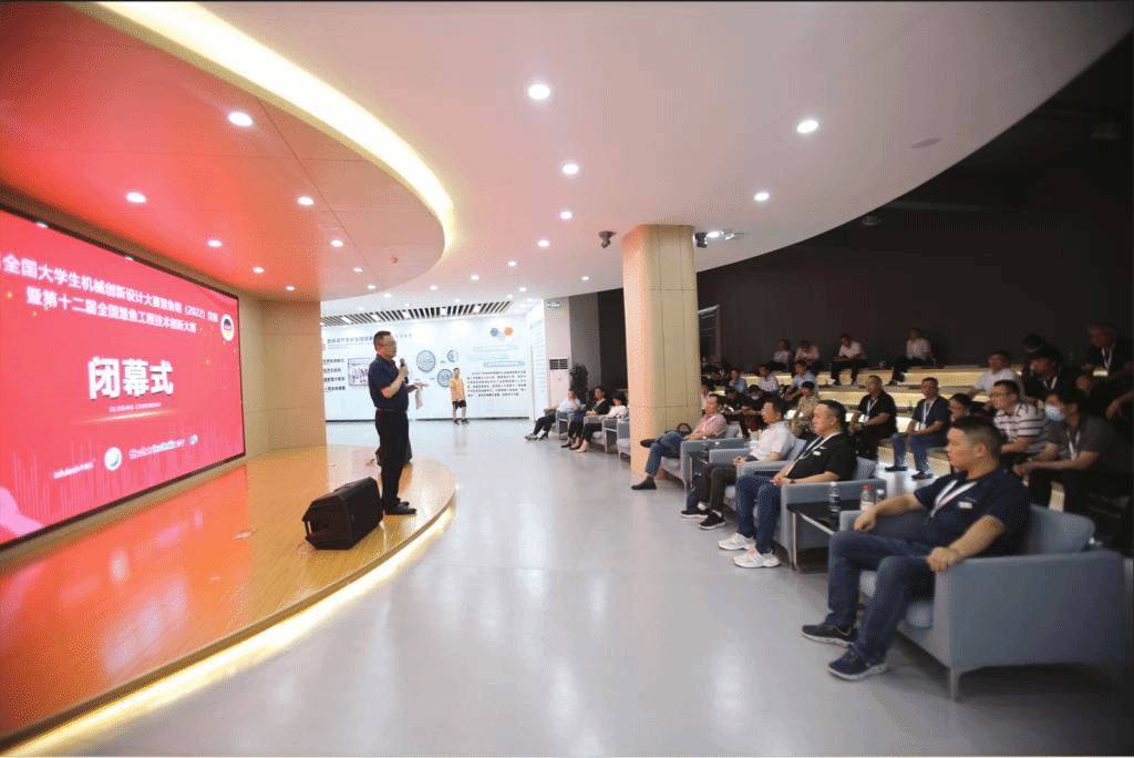全国大赛组委会秘书长、本届竞赛评审委员会主任、西安交通大学王晶教授在闭幕式上讲话,他对评审专家公正严谨的评审表示敬意,对承办单位北京中教仪人工智能科技有限公司和盐城工学院的周到服务表示感谢,对参赛师生的绝妙创意表示赞叹。他指出,全国大学生机械创新设计大赛不仅仅是单纯意义上的竞争和比赛,更是同学们施展本领、展现思维与实践动手能力的舞台,大家在这里互相交流、互相学习、共同进步,希望未来能有更多的师生加入到机械创新设计大赛中来。