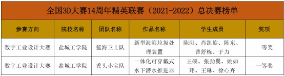 7月5日,全国3D大赛14周年精英联赛(2021-2022)总决赛榜单公布,我校机械优集学院侯鹏亮、郁倩等老师指导的《新型海滨垃圾处理装置》和《一体化可穿戴式水下推进器》获得全国一等奖。
