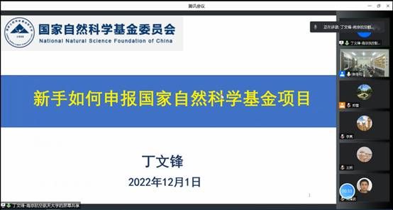 为了做好2023年国家基金项目申报工作,切实解决申报教师在项目申报中遇到的实际困难,12月1日,机械优集学院邀请南京航空航天大学丁文锋教授通过腾讯会议作专题辅导报告。学院院长周临震出席,副院长宦海祥主持报告会,拟申报2023年国家自然科学基金的全体教师以线上线下形式参加。