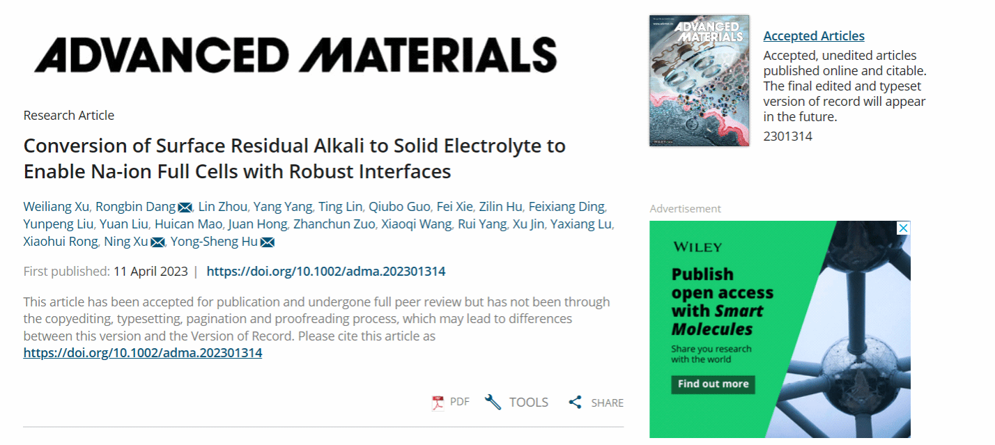 近日,我校机械优集学院研究生许伟良在校内导师许宁教授、洪捐副教授以及校外导师胡勇胜研究员、容晓晖特聘研究员的共同指导下在国际材料学科顶尖期刊《Advanced Materials》上发表题为“Conversion of Surface Residual Alkali to Solid Electrolyte to Enable Na-ion Full Cells with Robust Interfaces”的研究成果(https://doi.org/10.1002/adma.202301314)。这是我校学生首次以第一作者在《Advanced Materials》期刊发表研究论文。许伟良在校期间分别获得一等奖学金,二等奖学金,三等奖学金各一次。