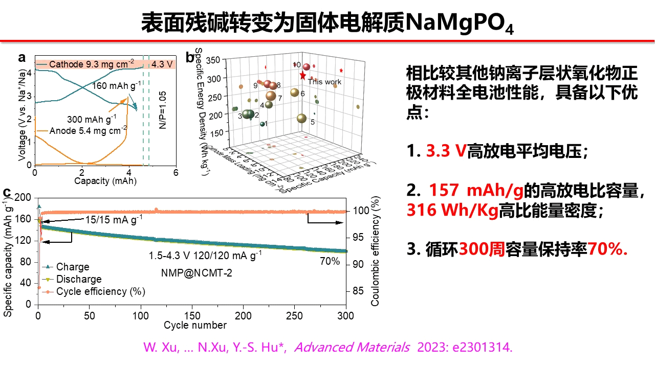 新能源是当前社会发展的热点,钠离子电池因其储量丰富可以与锂离子电池形成互补而备受关注。正极材料决定一个电池的上限,因此需要寻求一款高容量,循环稳定的钠离子电池正极材料。本文首次提出将正极材料的表面残碱转变为磷酸钠镁固态电解质,在正极材料表面形成坚固的界面膜,减少材料与电解液之间的反应,稳定结构。并首次在钠离子电池中发现4.25 V高电压阶段存在高度可逆的OP2相转变,有利于结构的稳定,提升循环性能。