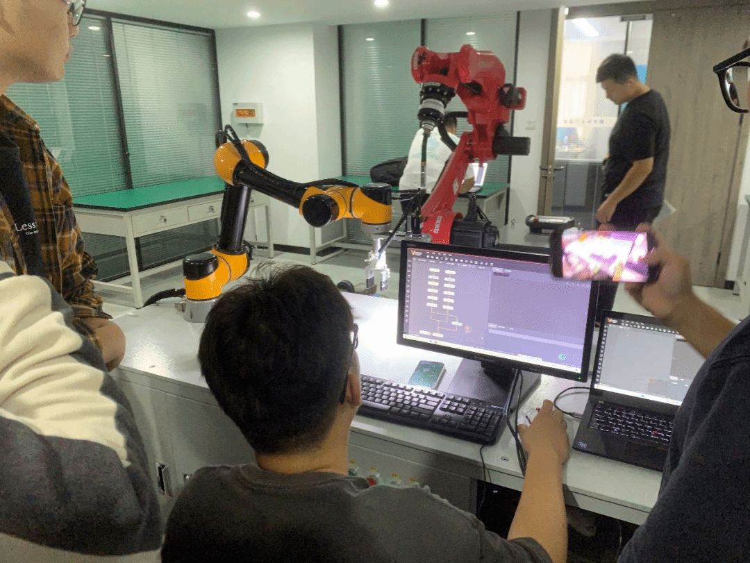 培训期间,工程师们热情高涨不减,细致地讲解了实验设备工作原理、运行流程、操作要点与注意事项,并进行动手操作示范,指导研究生操作实验设备;针对青年博士教师提出的科研需求,结合实际的项目案例进行开发讲解和应用演示。此次培训不仅满足研究生的专业知识需求,更加提升了科研素养与创新能力。同时,也进一步印证了产教融合、科教融汇、校企结合培养模式正成为研究生工程实践创新能力教育的主流方式,以产业需求、企业技术为导向,从企业中来到企业中去,切实解决工程实际问题,有助于提高广大青年博士教师和研究生的工程实践能力。据悉,机械优集学院近年来积极融入学校产教融合事业发展,紧贴国家高新区和盐南高新区的产业发展需求,先后在西伏河人工智能产业研究院和盐龙湖先进技术研究院建立机器视觉实验室、并联机器人实验室、无人系统实验室、工业数字孪生实验室、智慧物流实验室及智慧药房实验室等专业科研实验室,设备总投入超过1200万元。