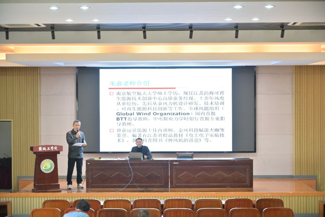 朱鑫首先展示了江苏沿海可再生能源技术创新中心的科技产品,简要介绍风力发电机基础知识及电气控制,主要说明机电传动控制课程相关电气元器件在风电行业中的应用,重点讲授了各种电器件的原理、用途、图形符号等内容。