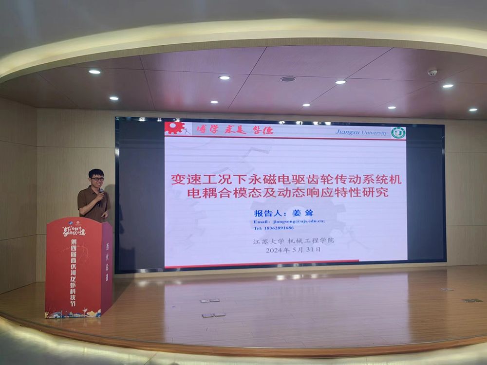 江苏大学机械工程学院姜耸博士作题为《变速工况下永磁电驱齿轮传动系统机电耦合模态及动态响应特性研究》的学术报告。姜博士从永磁同步电机与齿轮减速机构组成的传动系统动力学建模入手,详细分析了变速工况下电驱系统扭转共振的动态响应特性,以及电驱系统机电耦合的动力学特性和振动特性,并结合传动系统实验台对各种工况下实验台的动态响应特性进行了测试分析。