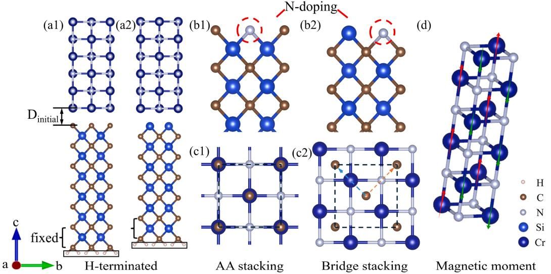 Fig. 2. calculations model of CrN/3C-SiC heterostructure thin film (a1) Initial structural model of CrN(001) and C-terminated 3C-SiC(001), (a2) Initial structural model of CrN(001) and Si-terminated 3C-SiC(001), (b1) N-doped C-terminated 3C-SiC(001) surface, (b2) N-doped Si-terminated 3C-SiC(001) surface, (c1) AA stacking model of CrN/3C-SiC interface, (c2) Bridge stacking model of CrN/3C-SiC interface, (d) Initial antiferromagnetic moment setting of CrN.
