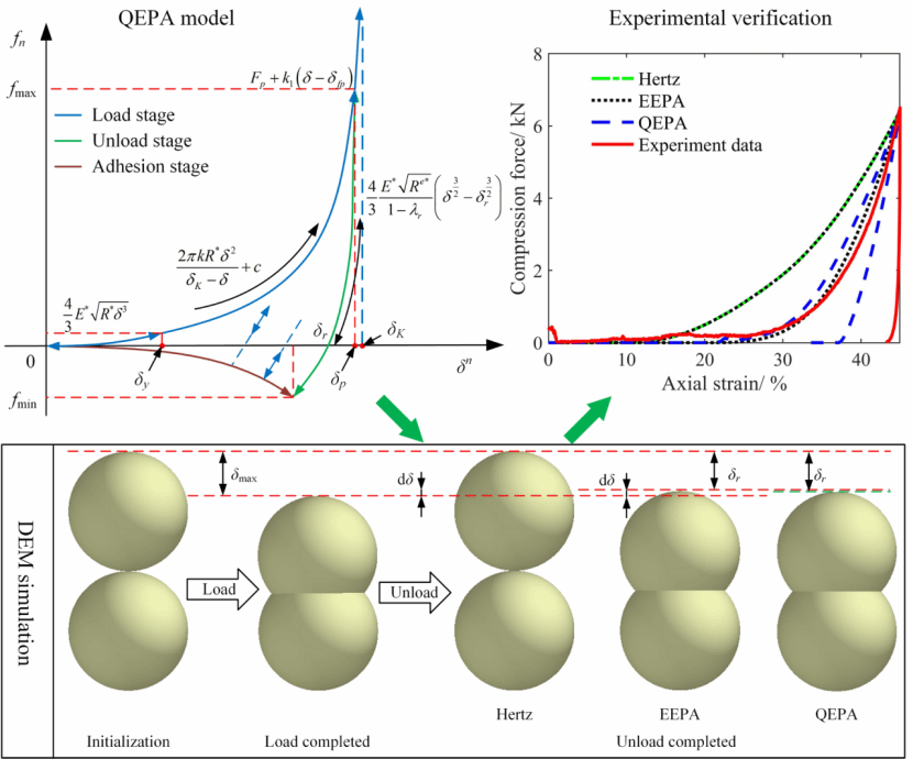 该研究针对粉末冶金、饲料加工与制药等行业中的粉末压缩过程,提出了一种新型的准静态弹塑性黏附接触模型(Quasi-static elasto-plastic adhesion, QEPA模型),显著提升了离散元法在模拟粉末非线性压缩行为中的精度与可靠性。该研究通过结合经典压实方程与弹塑性接触力学,系统描述了粉末在压缩过程中的弹性、弹塑性、全塑性及黏附阶段,并设计了单孔闭式压缩、单孔开式压缩及回弹验证三种实验装置,全面验证了模型的预测能力。实验与仿真对比结果表明,QEPA模型能够准确再现粉末的压缩-挤出转变行为及卸载过程中的弹性恢复效应,其预测回弹位移与实验值误差仅为2.04%,整体模拟误差较传统Hertz与EEPA模型降低52.51%。该模型为粉末成型工艺的优化与设备设计提供了可靠的理论工具与仿真基础。