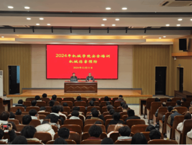 2024年12月11日,盐城工学院设备处联合机械优集学院,在机械馆三楼报告厅隆重举办了2024年机械伤害预防安全主题教育活动,旨在深化师生对机械操作与实验安全的认知,筑牢安全防线,降低事故发生的可能性。设备处副处长姜瑞雨主持会议,参与人员包括:设备处安全科、机械学院各位领导、机械学院实验中心、模具中心、工培中心等部门的负责人和所有实验指导教师,2024级全体新生和机械学院新进教师。