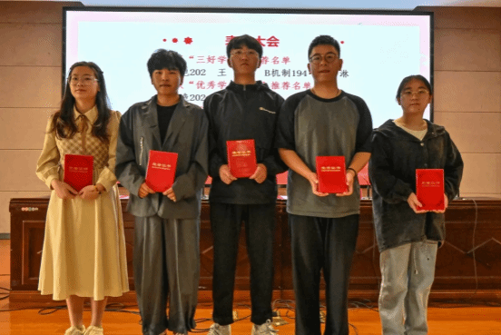 马晓英宣读《教育部关于2021-2022学年度本专科生国家奖学金获奖学生名单的公告》《机械优集学院关于表彰2023届毕业生考研优秀个人的决定》、机械优集学院2023年度省级三好学生、优秀学生干部和先进班集体推荐名单。程云庆介绍了学院学风建设月活动方案。学院领导为获奖个人和集体代表颁发了证书。